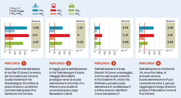 Il PM10 è sempre oltre la soglia, il PM2,5 (ancora più pericoloso del PM10 perché ha un diametro che riesce a penetrare la barriera cellulare e ad entrare nell’apparato respiratorio) la supera in un percorso ed è al limite in un altro.